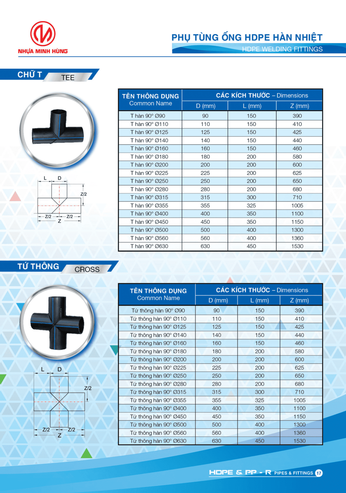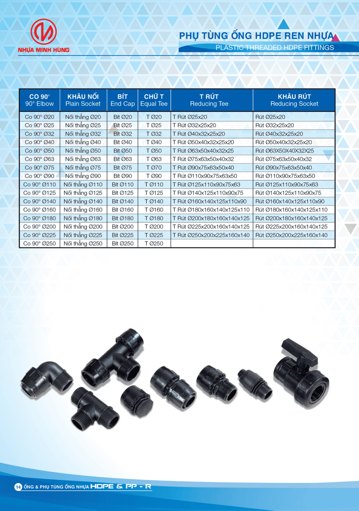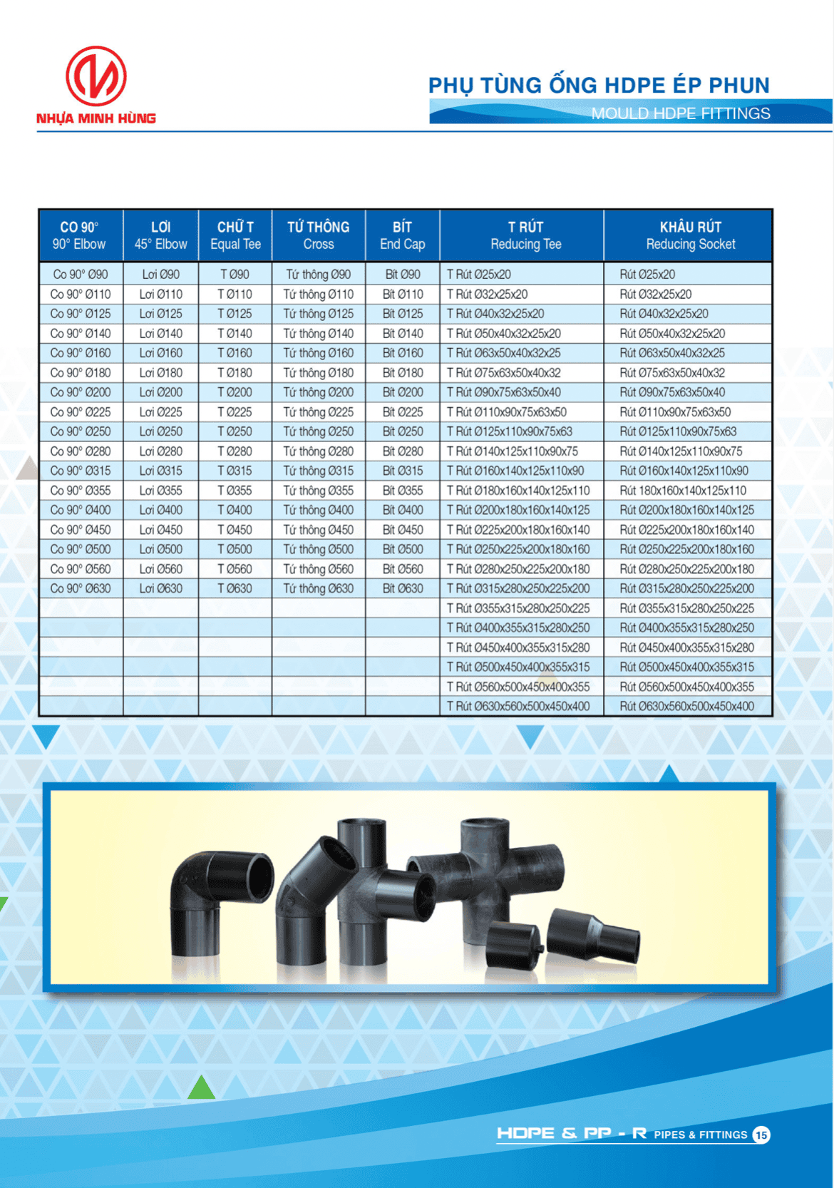 Phụ tùng HDPE (High-Density Polyethylene): loại phụ tùng được sản xuất bằng nhựa polyethylene lọc từ dầu thô sau đó trùng phân qua các xúc tác như crom, silic catalyst… để tạo ra một loại polyethylene có tỉ trọng cao, độ bền kéo cao. Ống nhựa HDPE thường dày, cứng, có khả năng chống chịu va đập, kéo căng tốt hơn so với nhựa PE thông thường.