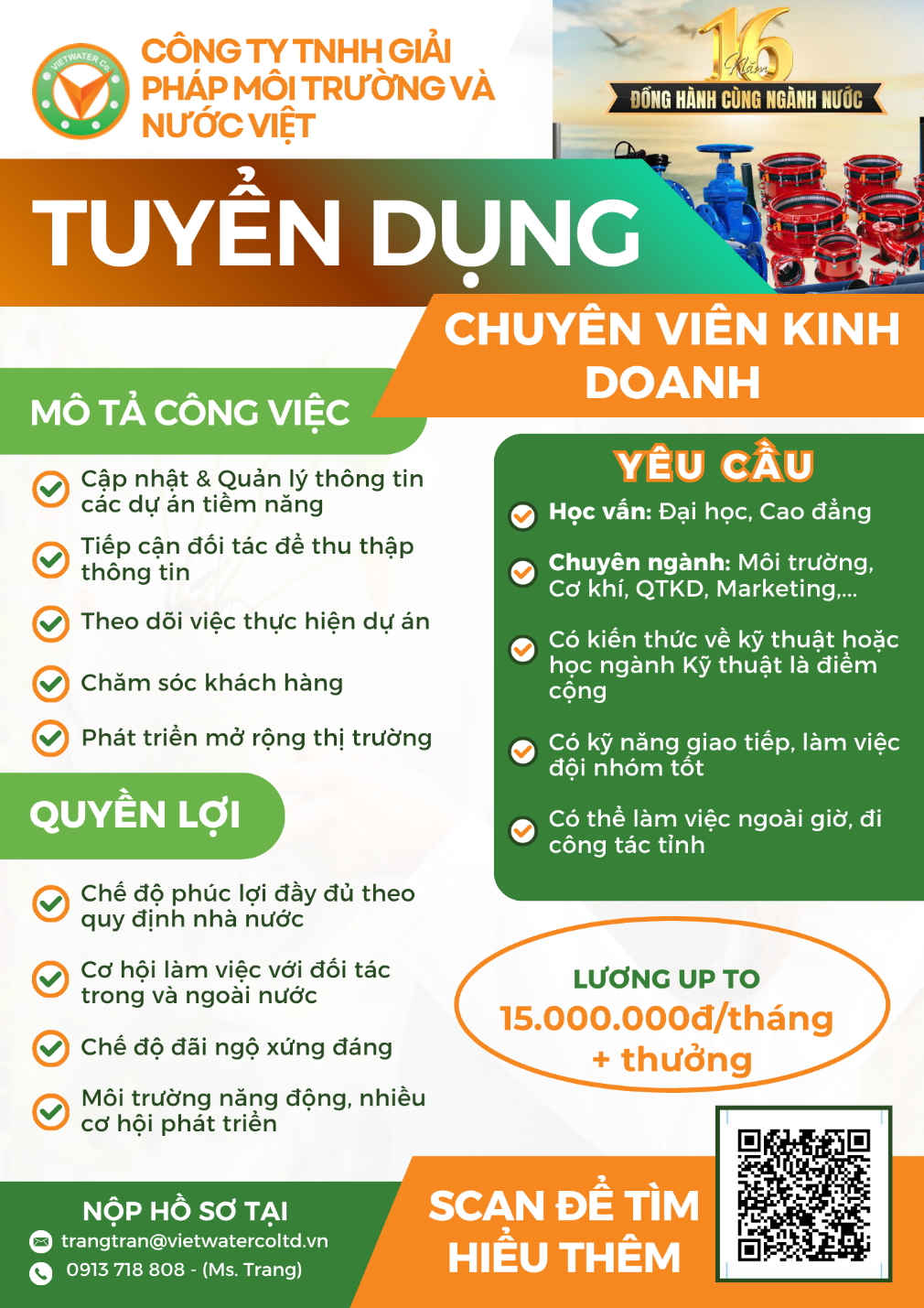 Công ty TNHH Giải pháp Môi Trường và Nước Việt – đơn vị với hơn 16 năm kinh nghiệm trong lĩnh vực vật tư ngành nước, ống gang, van, phụ kiện và giải pháp môi trường toàn diện, hiện đang tìm kiếm Chuyên viên Kinh doanh năng động, nhiệt huyết để cùng mở rộng thị trường và phát triển bền vững.